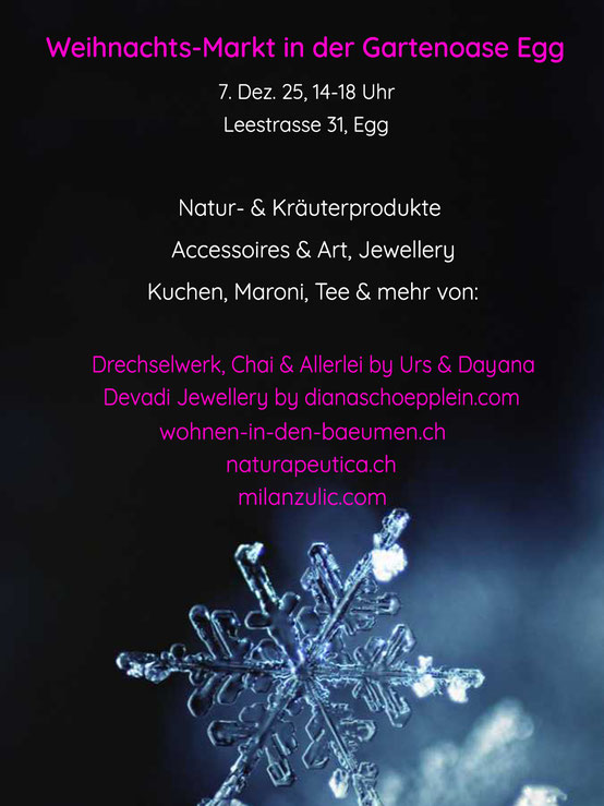 Mit verschiedenen AusstellerInnen und deren Produkte wie: Naturapeutica Kräutertees & Räucherwaren, Kräuterkugeln, Nutzhanfprodukten, selbstgemachten Accessoires etc. und dazu gibt es feinen Kuchen und Tee.