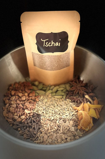 Sternanis, Gewürznelke, Fenchel, Kardamom, Zimt, Orangenschale, Apfelstücke