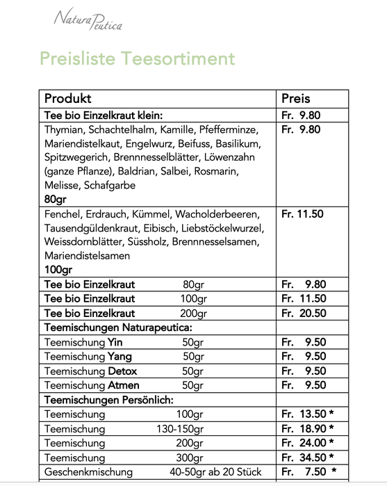 * Aufwand für die Erstellung des Rezeptes und Teemischungs-Herstellung wird separat berechnet.